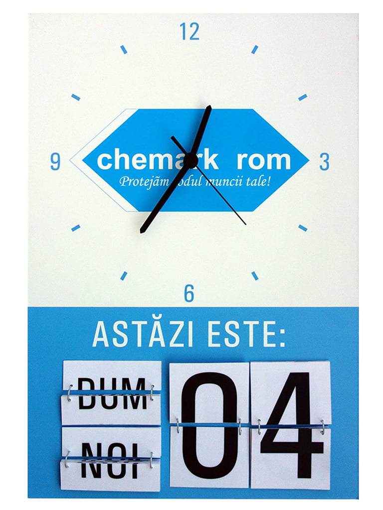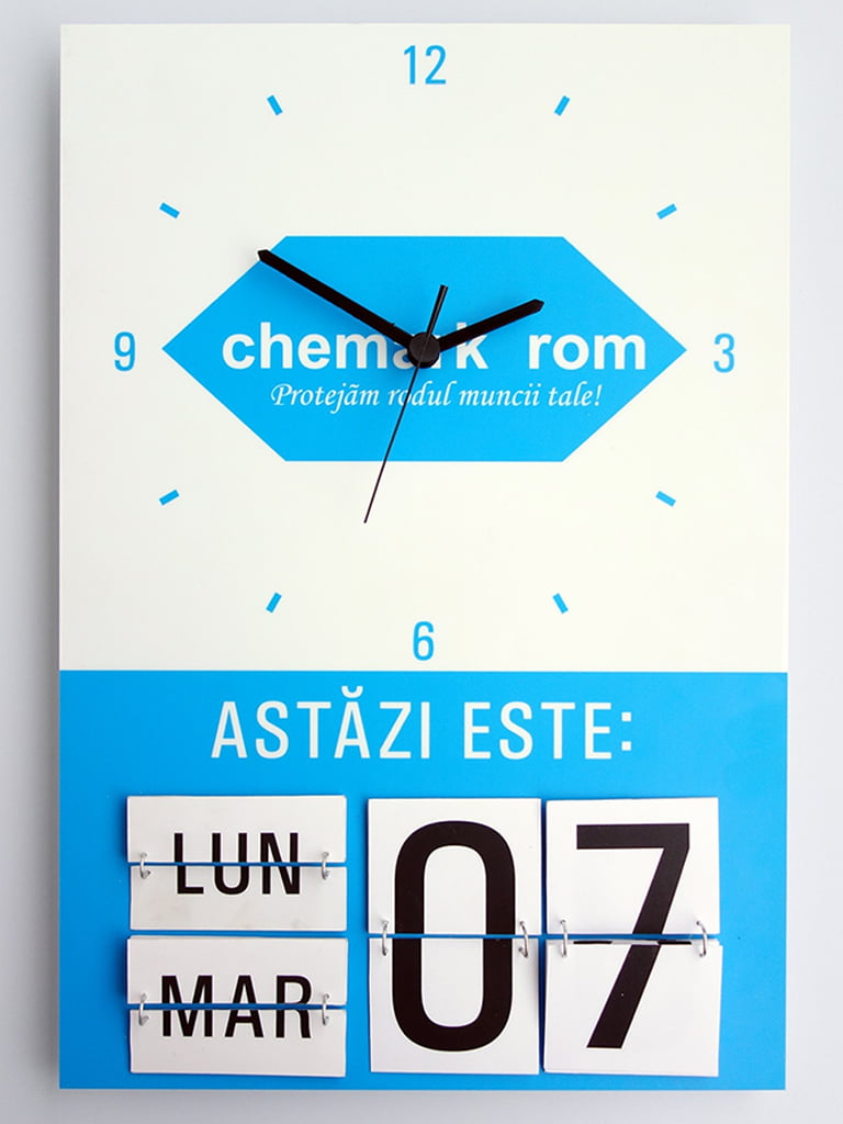 Realizat din plastic, cu inele de metal, file plastifiate. Design-ul ceasului a fost conceput pentru a integra sigla companiei cât mai estetic. Este un ceas de perete pentru agricultori și fermieri. Pentru ei, zilele și lunile anului sunt poate mai importante decât orele și minutele, astfel că ideea de cadou a Chemark Rom pentru ei ni s-a părut ce-a mai potrivită.