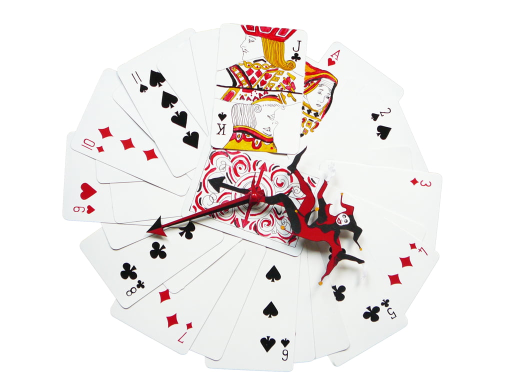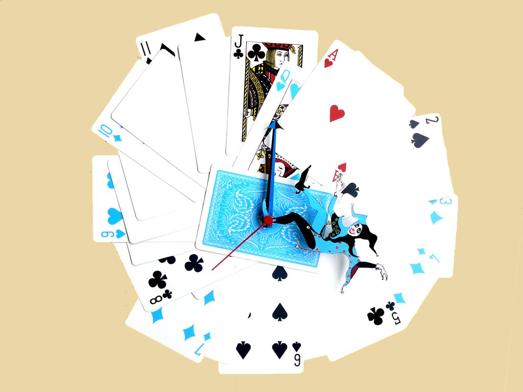 Small blind, raise, pre-flop, raise, flop, raise, turn, river și alții sunt termeni mai mult decât cunoscuți de jucătorii de poker. Ceasul nostru de perete este pentru cei ce iubesc poker-ul, jocurile cu carti de joc sau chiar trucurile. Cartile de joc sunt realizate din metal ușor ca greutate și rezistent. Ne-am inspirat de la pachetele reale de carți de joc, le-am realizat la mărimi mai mari pentru a fi vizibile. Aranjate în formă de eventai, dau impresia de un veritabil pachet de cărți dar mai mare.