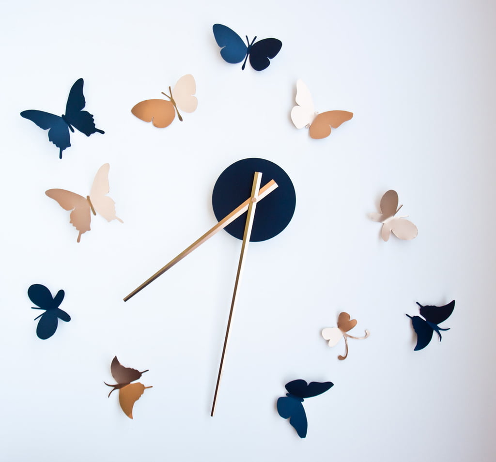 Ceasul are fluturi 3D realizati din metal. Sunt rezistenți dar și flexibili astfel ca aripile pot fi îndoite cu ușurință și vin pregatiți pentru a se așeza pe orice suprafață. Modelul este realizat la comandă și poate fi în orice culori, dimensiuni cu mai mulți sau mai puțini fluturi.